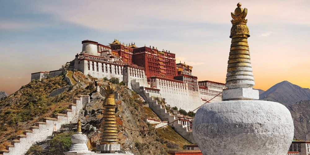 Le palais du Potala est un palais-forteresse du 17ème siècle, situé sur la colline de Marpari au centre de la vallée de Lhassa. Comprenant un « palais blanc » et un « palais rouge », ainsi que leurs bâtiments annexes, l’édifice incarne l’union du pouvoir spirituel et du pouvoir temporel et leur rôle respectif dans l’administration du Tibet. Construit par le cinquième dalai-lama, le palais fut notamment le lieu de résidence principal des dalaï-lamas successifs, jusqu’à la fuite du 14ème Dalai Lama en Inde en 1959. Aujourd’hui, le palais est devenu un musée de la république populaire de Chine.Aux XVIIIe et XIXe siècles, cet édifice de treize étages comptait parmi les plus hauts du monde.